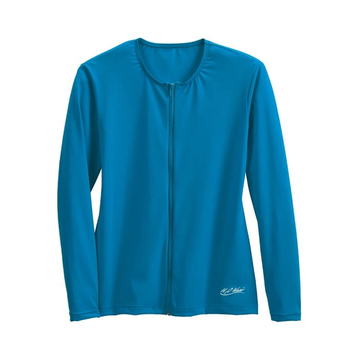 A comfortable shirt, complete with handy front zipper and 50+ UPF sun protection, is a perfect choice to keep the chill off before, during, and after your water workouts. Long Sleeve. Unlined. Imported. Made of ultra-chlorine-resistant ChloroGuardâ„¢.